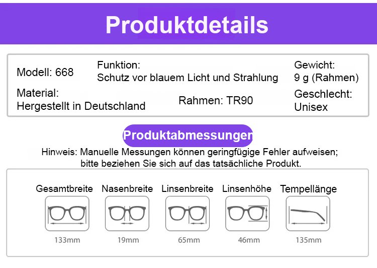 ● Ultraleichte Lesebrille mit integriertem Blaulichtfilter schützt Ihre Augen zuverlässig vor schädlicher Bildschirmstrahlung und sorgt für angenehmes Lesen am PC oder Smartphone. ● Das moderne, schlanke Design und das geringe Gewicht ermöglichen maximalen Tragekomfort – ideal für unterwegs, im Büro oder zu Hause. ● Die hochwertige Verarbeitung und langlebigen Materialien garantieren eine lange Lebensdauer und machen die Brille zum perfekten Begleiter im Alltag. ● Dank integrierter Lesefunktion und Blaulichtfilter erleben Sie entspanntes Lesen ohne müde oder gereizte Augen – für mehr Konzentration und Wohlbefinden.